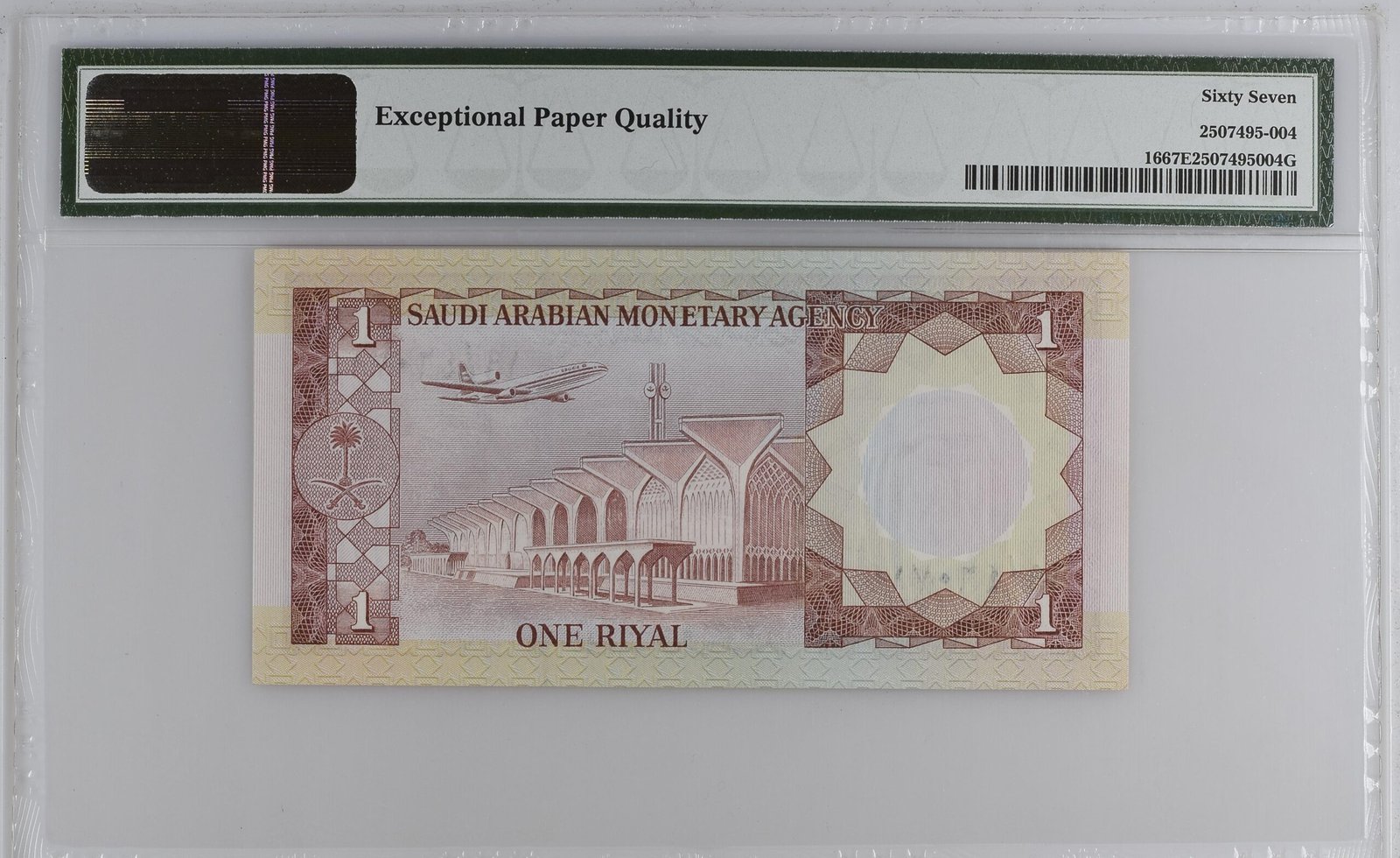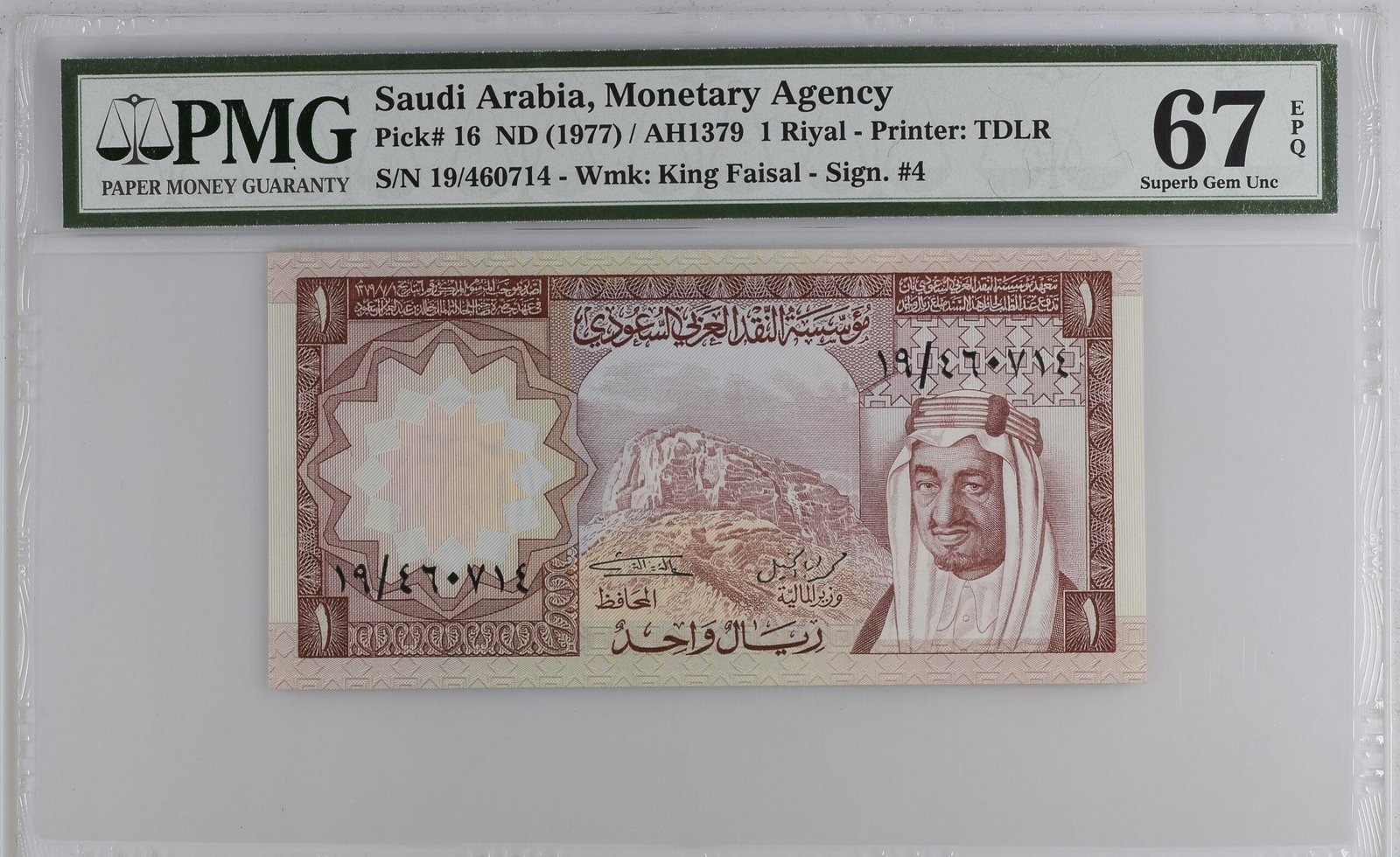 وصف الورقة النقدية: المملكة العربية السعودية، الوكالة النقدية، 1 ريال ND (1977) / AH 1379