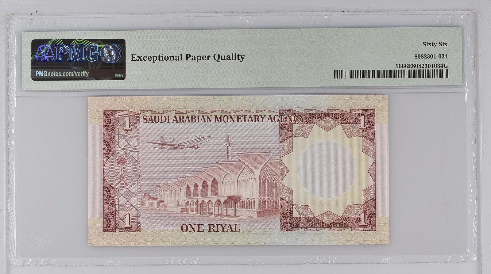 وصف الورقة النقدية: المملكة العربية السعودية، الوكالة النقدية، 1 ريال ND (1977) / AH 1379