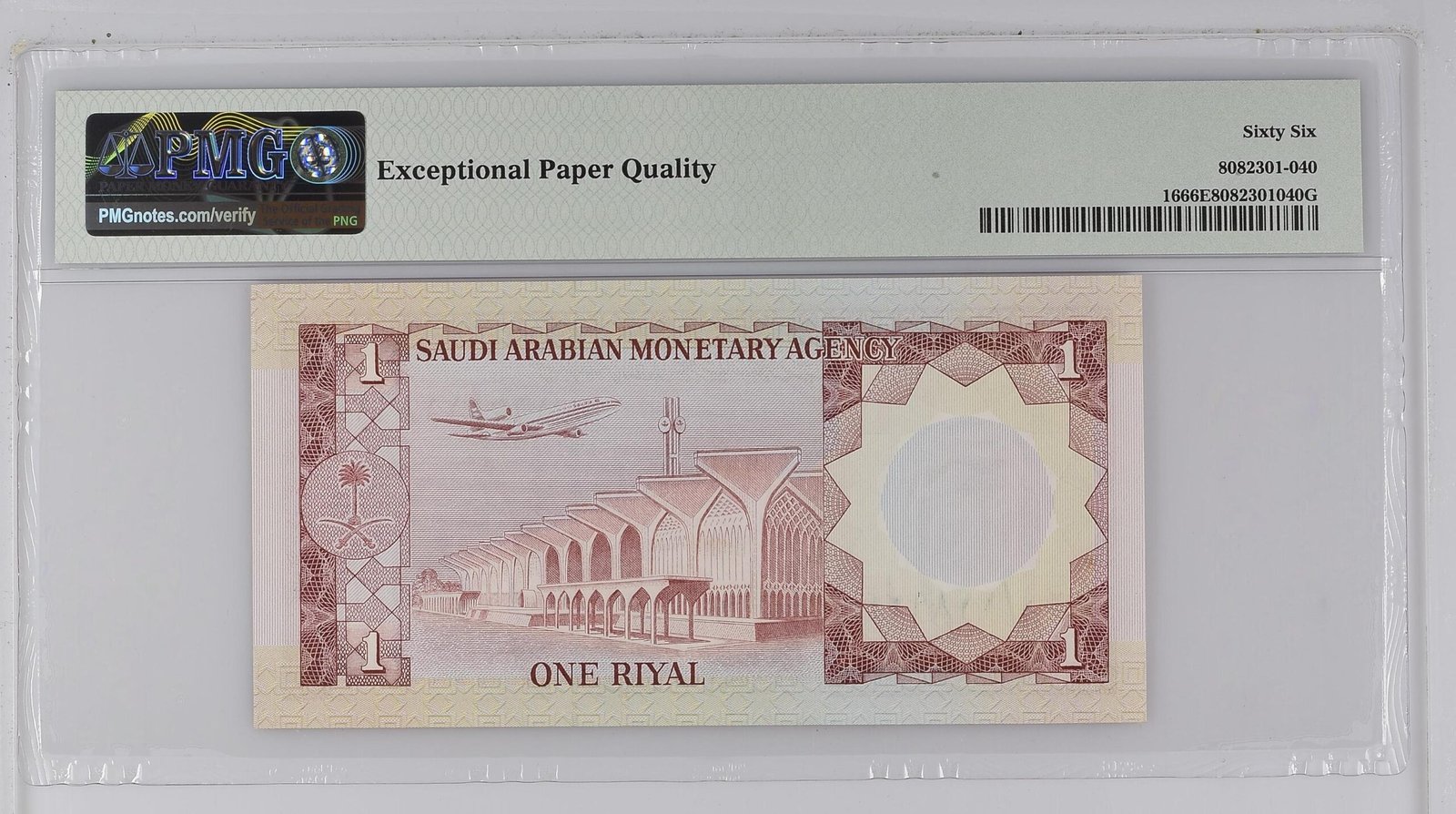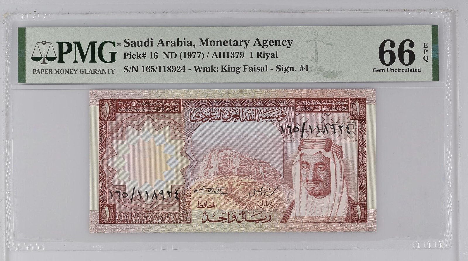 وصف الورقة النقدية: المملكة العربية السعودية، الوكالة النقدية، 1 ريال ND (1977) / AH 1379