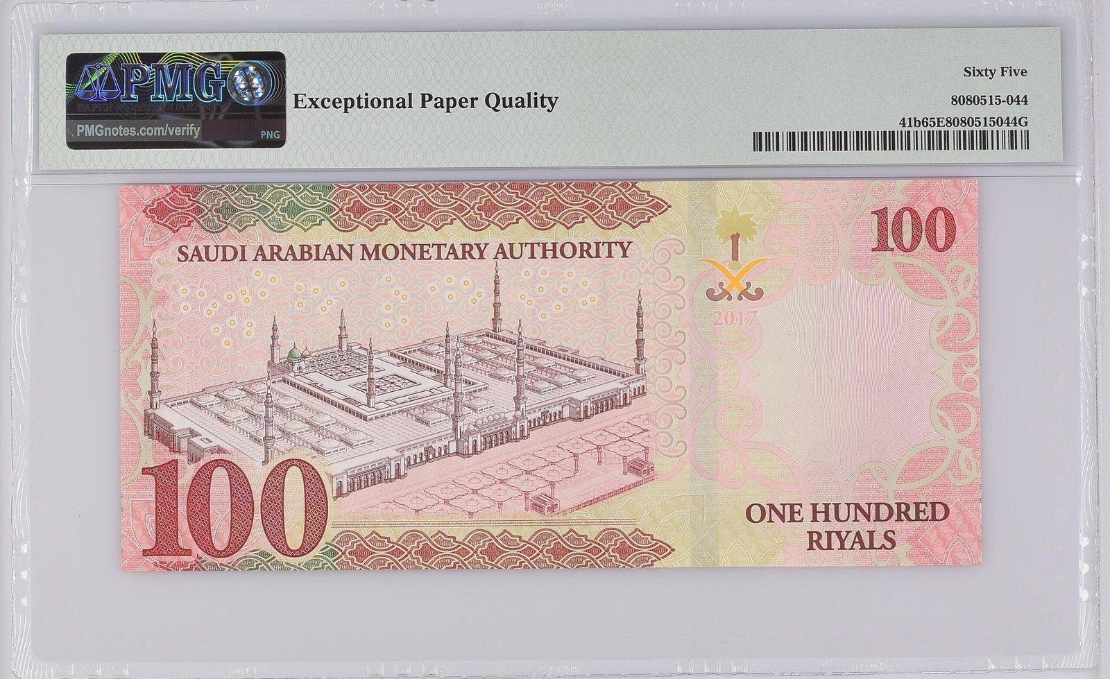 وصف الورقة النقدية: المملكة العربية السعودية، السلطة النقدية، 100 ريال 2017 / 1438 هـ – الطابعة: TDLR