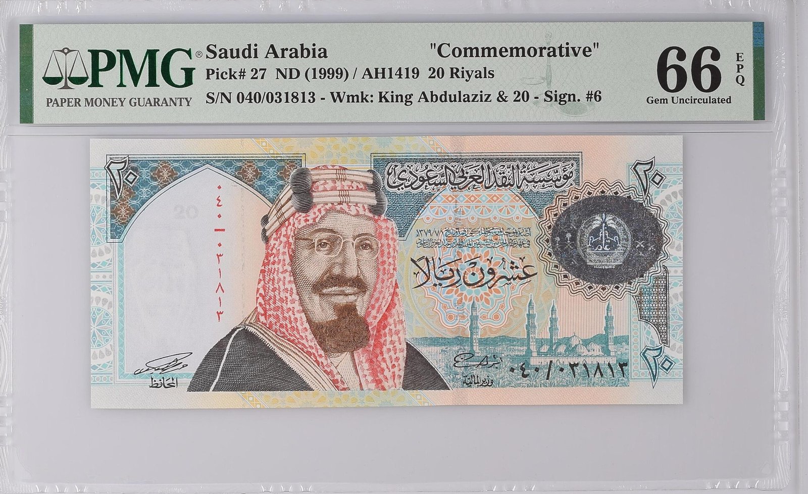 وصف الورقة النقدية: المملكة العربية السعودية “تذكاري”، 20 ريال بدون تاريخ (1999) / هـ1419