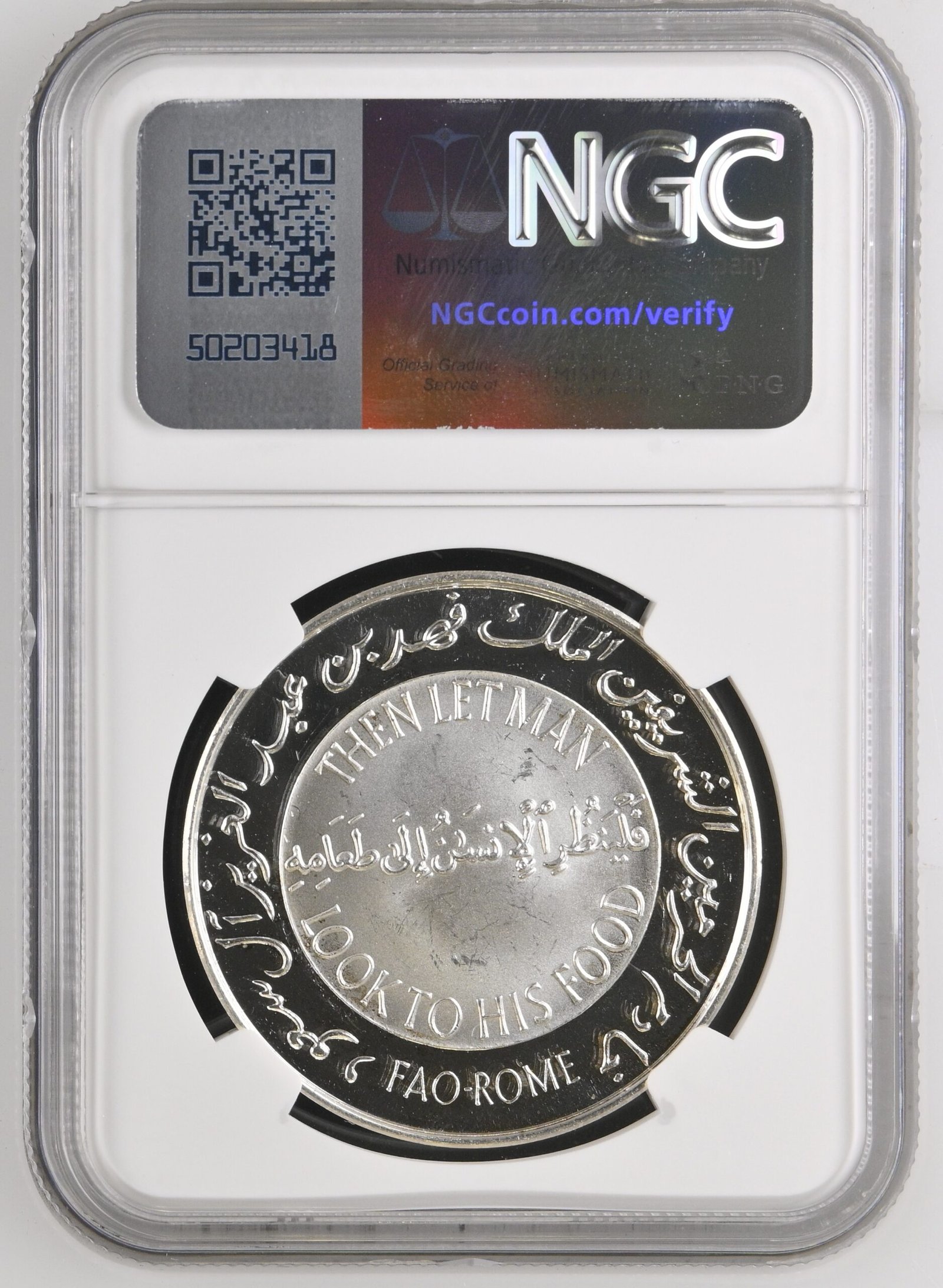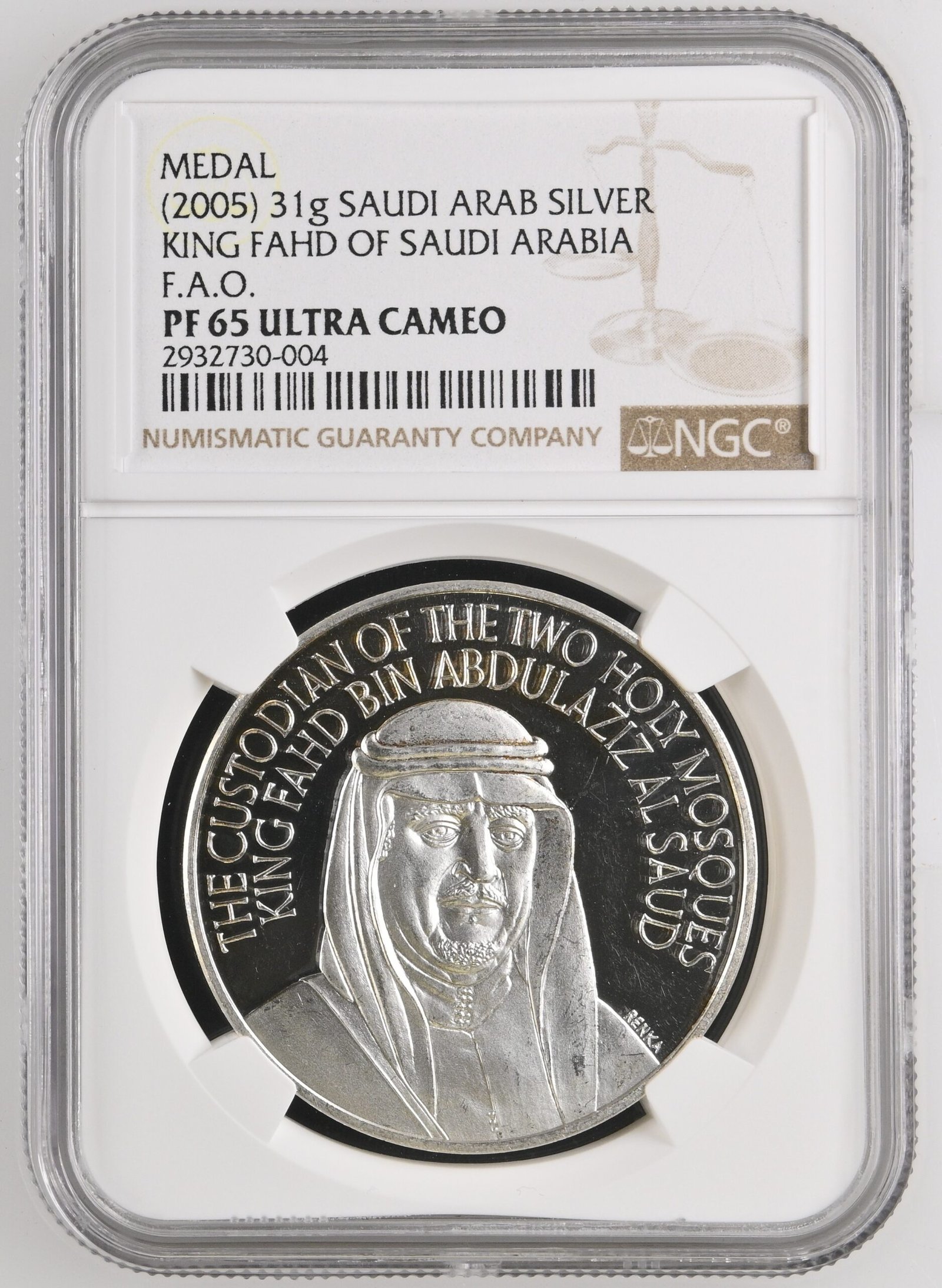 ميدالية فضية تذكارية جميلة تزن 31 جرامًا تكريمًا لـالملك فهد بن عبد العزيز آل سعود، صدرت عام 2005 للاحتفال بمبادرة منظمة الأغذية والزراعة (الفاو).