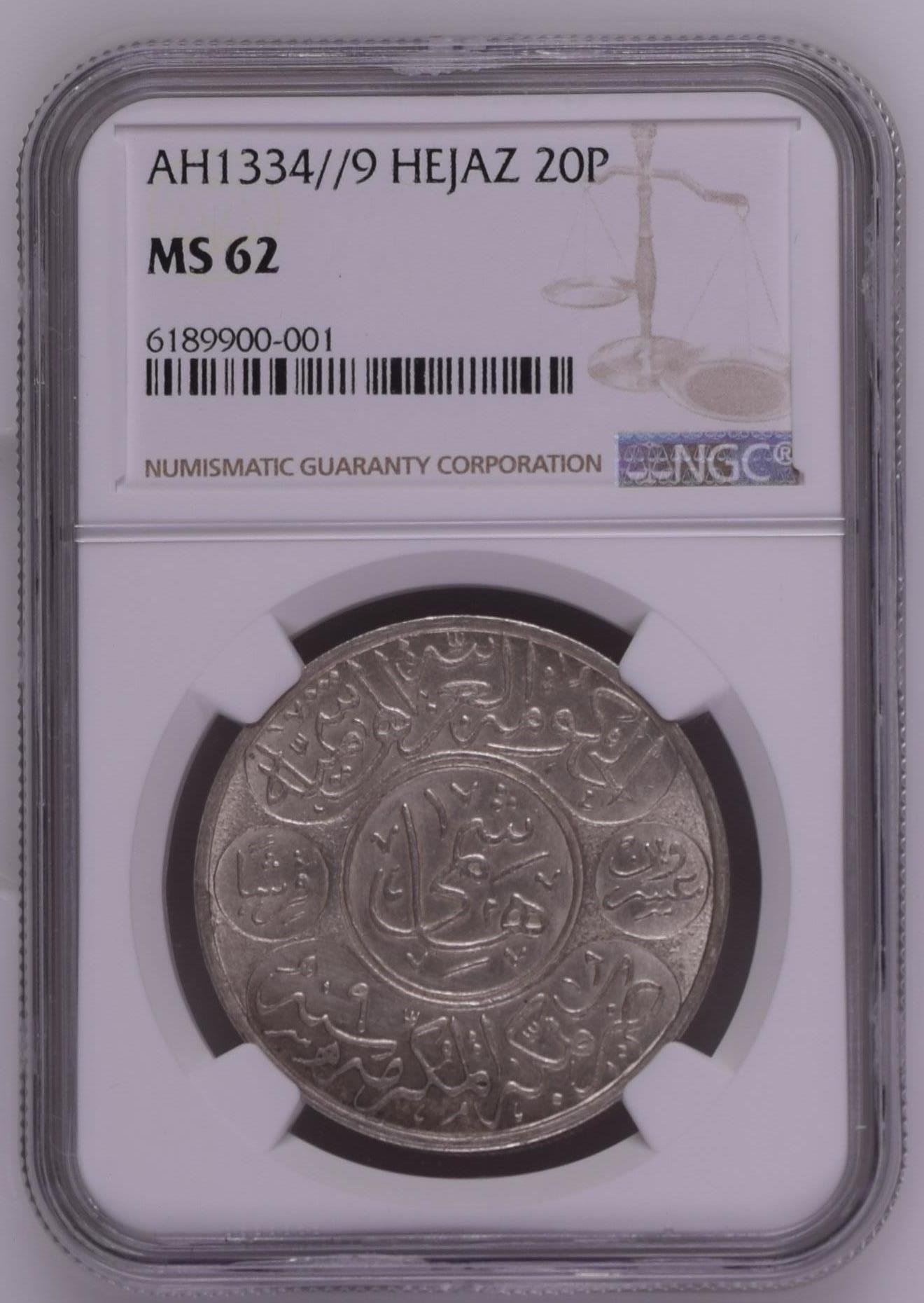 The notation AH1334//9 indicates the approximate minting period, spanning AH 1334 to AH 1339, during the era of the Kingdom of Hejaz prior to the unification of Saudi Arabia. The term 20 Qirsh refers to the denomination used at the time within the late Ottoman monetary system that remained in circulation in Hejaz.
