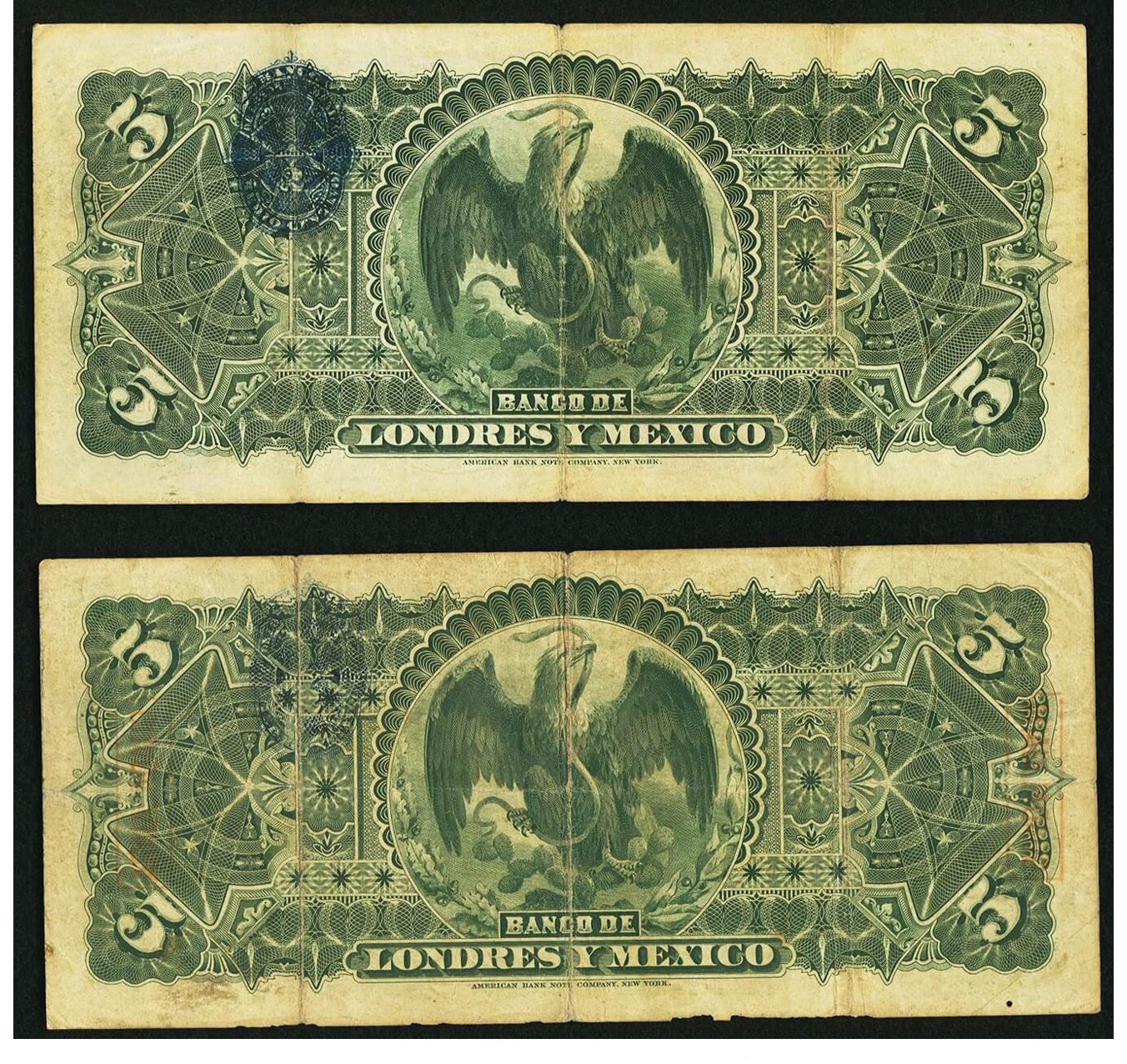 Mexico Banco de Londres y Mexico 5 Pesos 2.1.1912 Pick S233g and 1.7.1910 Pick S233q.