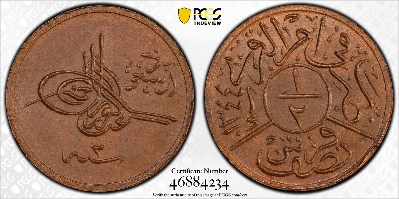 HEJAZ & NEJD: ‘Abd al-‘Aziz b. Sa’ud, 1924-1926, AE ½ ghirsh, Umm al-Qurrâ (Mecca), AH1344 year 2, KM-A3, a wonderful mint state example! PCGS graded MS64 BN. Struck in Mecca with the mint epithet as Umm al-Qurrâ (Mother of All Villages).