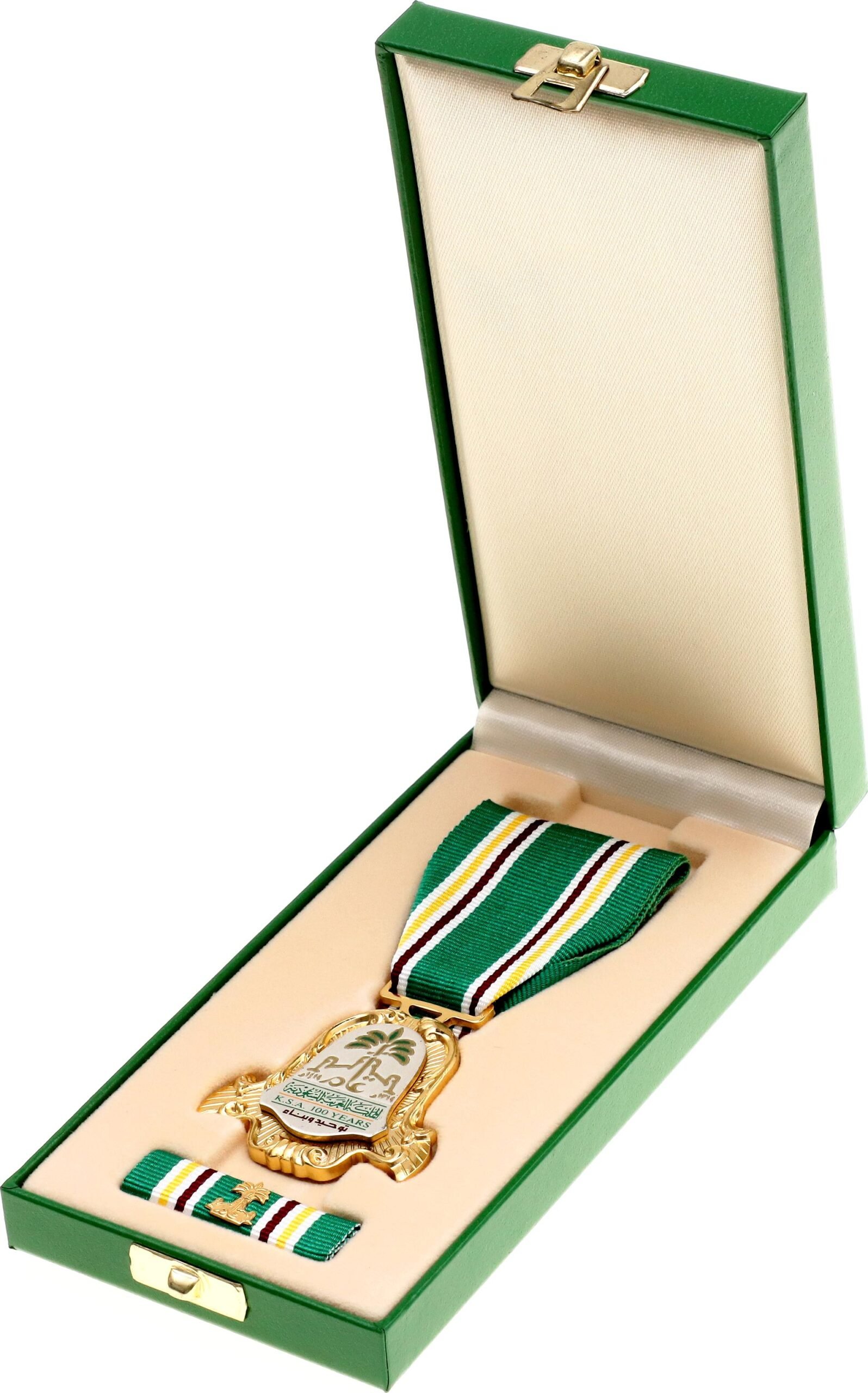 The Saudi Arabia Medal in Commemoration of the 100th Anniversary of the Kingdom of Saudi Arabia 1999 is a distinguished and commemorative medal that holds significant historical importance. This medal was created in 1999 to mark the 100th anniversary of the establishment of the Kingdom of Saudi Arabia. Crafted from a combination of white metal (WM) and bronze (AE), this medal measures 48×40 mm in size and features intricate enamel work, adding a touch of elegance to its design. The original ribbon and bar contribute to its authenticity and traditional appearance. The fact that it comes in its original box further enhances its value and historical significance. This medal serves as a reminder of the rich heritage and legacy of Saudi Arabia, celebrating a century of the country’s existence. It symbolizes the unity, progress, and achievements of the Kingdom over the years. Owning this medal can be a source of pride and a way to connect with the history and culture of Saudi Arabia. It serves as a tangible representation of a significant milestone in the nation’s history, making it a cherished collectible for enthusiasts and historians alike.