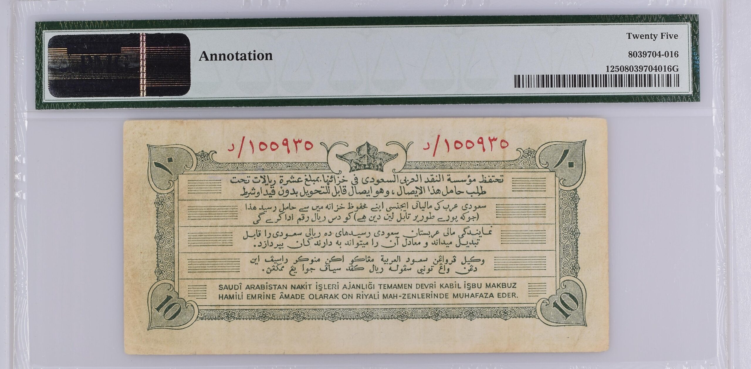 - Note Description: Saudi Arabia, Monetary Agency, 10 Riyals ND (1953) / AH1372 – Printer: TDLR