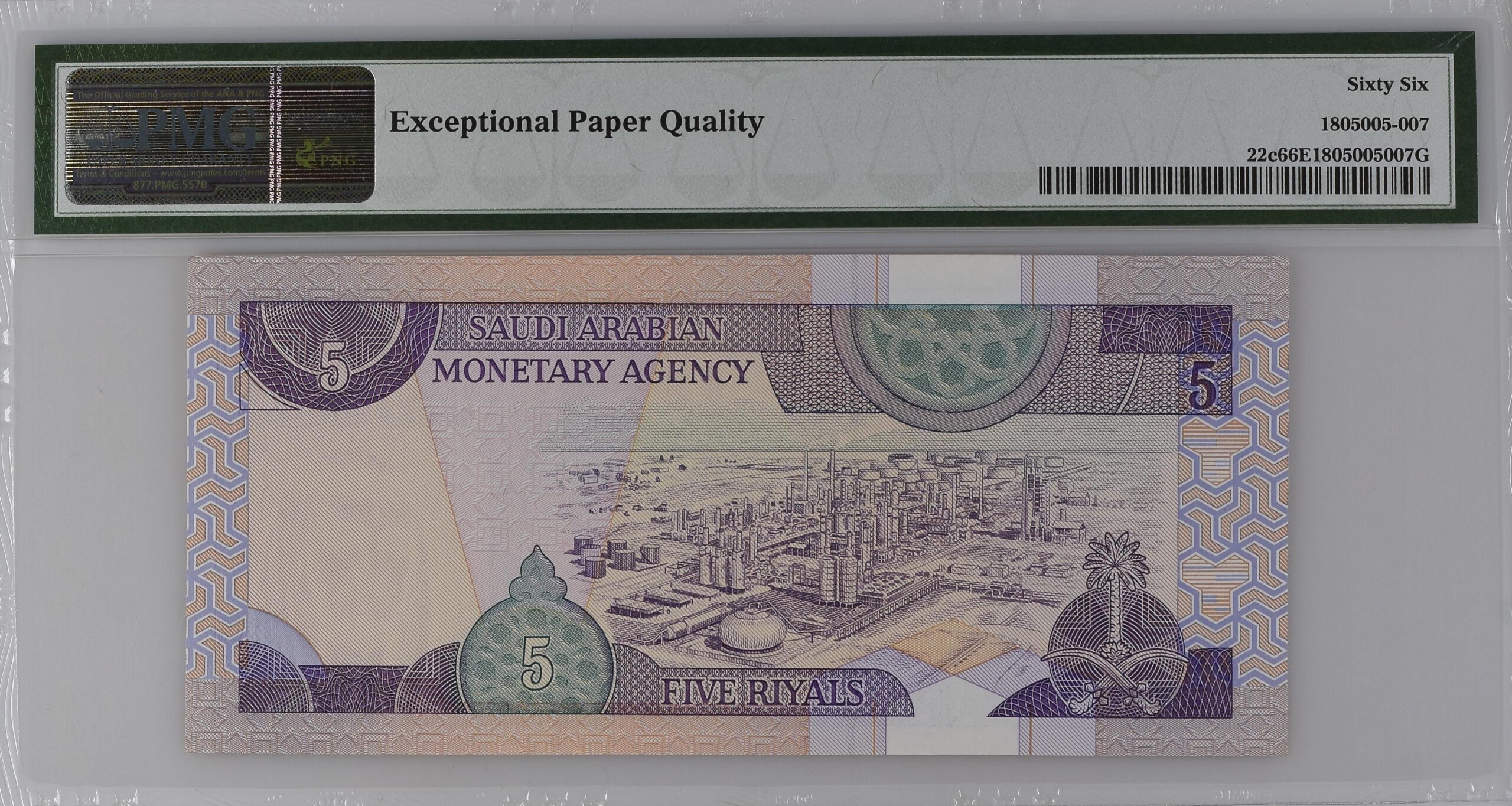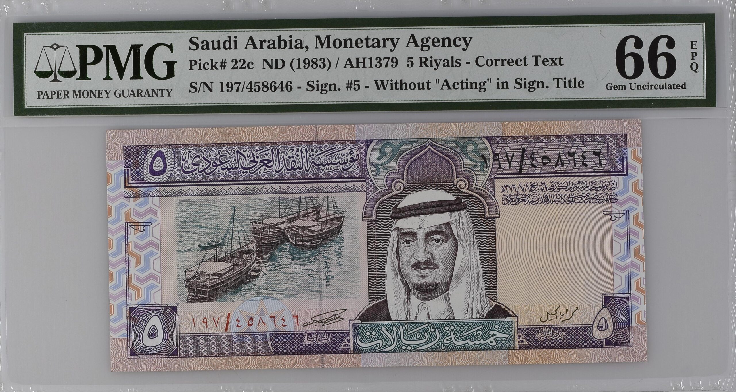 Note Description: Saudi Arabia, Monetary Agency, 5 Riyals ND (1983) / AH1379 – Correct Text