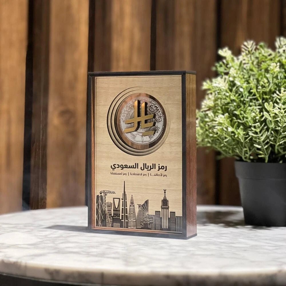 This elegant design combines heritage and modernity, crafted from transparent acrylic engraved with the historic Saudi Riyal seal using precision laser technology.